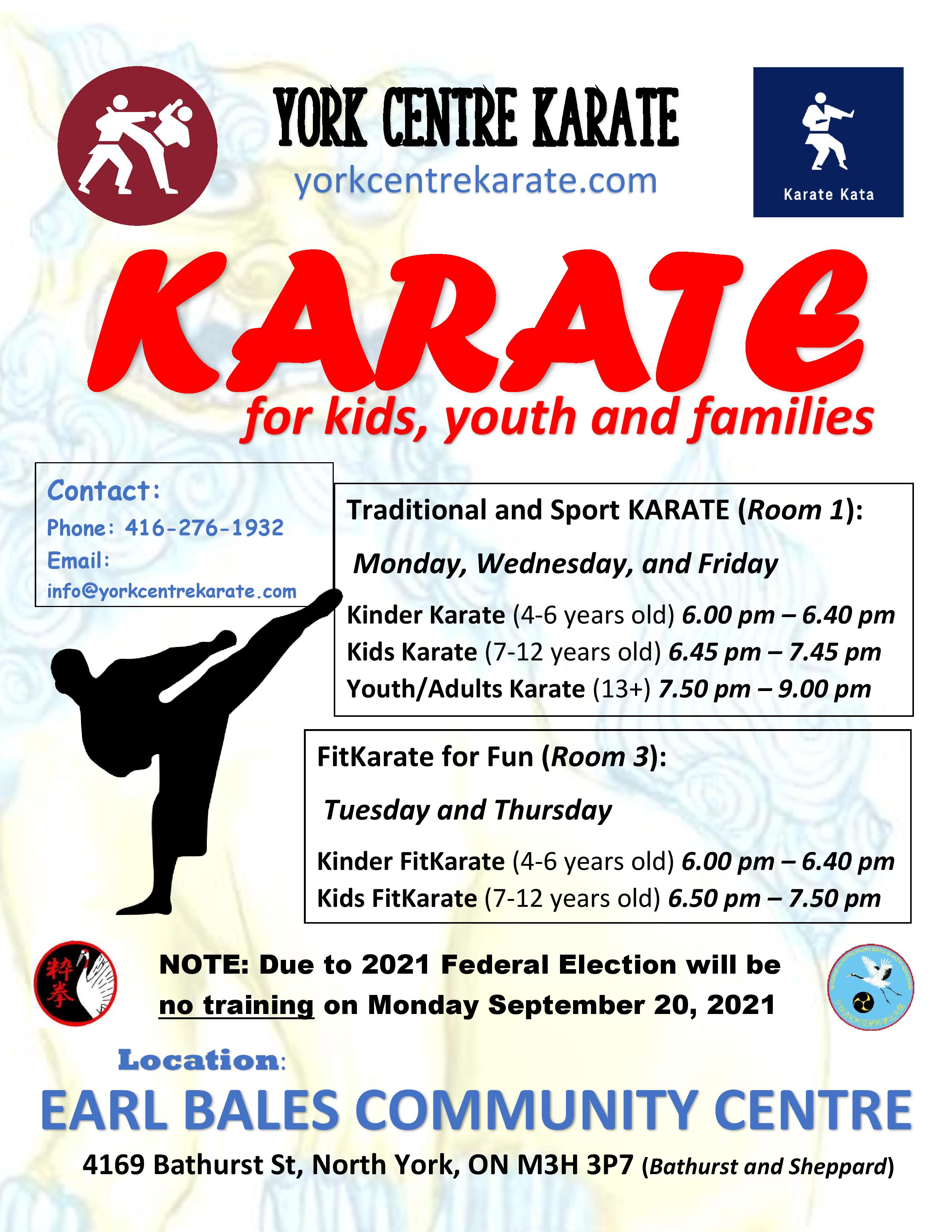 Tuesday, September 21 – Room 3 – Kinder Karate (4-6 years old) 6 pm – 6.40 pm, Kids Karate (7-12 years old) 6. 45 pm – 7.45 pm, no youth/adults class,